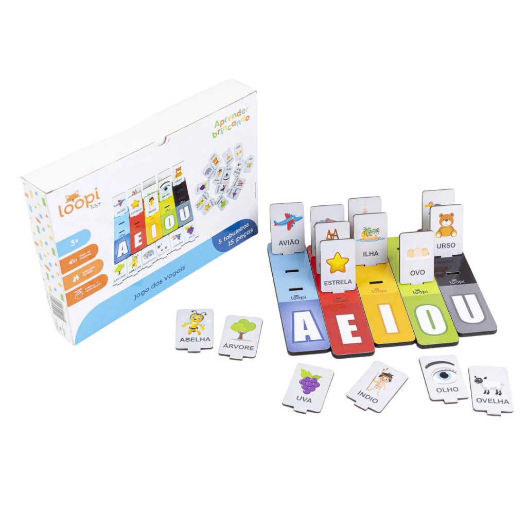 APRENDIZADO PRÁTICO DAS VOGAIS • MATERIAL RESISTENTE • DESIGN COLORIDO • DESENVOLVE HABILIDADES COGNITIVAS