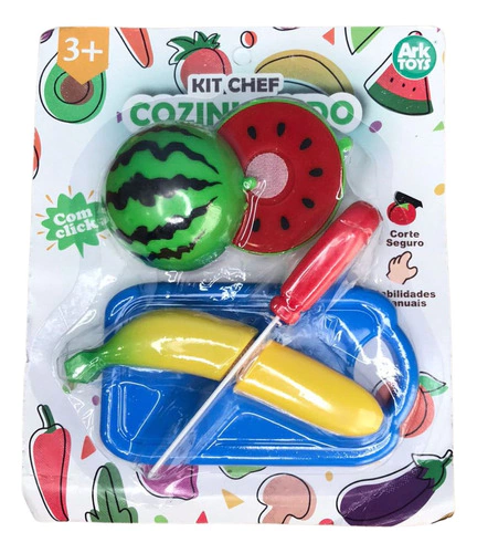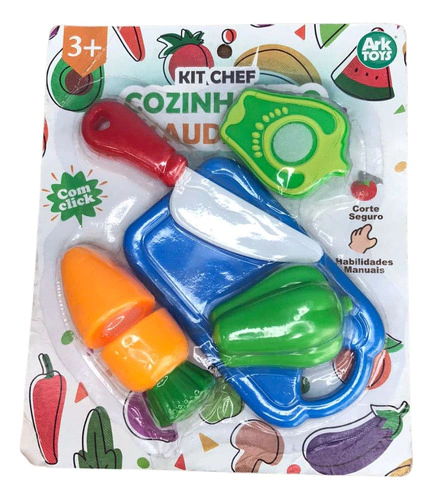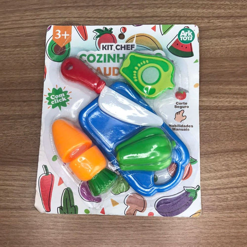 - Utensílios de cozinha inclusos: tábua de corte, faca de brinquedo, panelinha e colher
